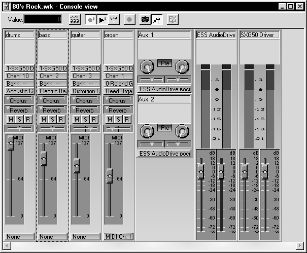 Смену банков и инструментов можно выполнить и в реальном времени при записи или воспроизведении с помощью микшера, который называется Console (Пульт). Чтобы открыть его, выполните одноименную команду из меню View или нажмите кнопку Console View на инструментальной панели. Вашему взору откроется окно Console, показанное на рис. 4.16.