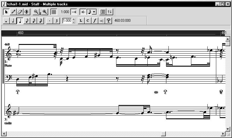 Окно Staff позволяет просматривать и редактировать композицию в виде стандартной нотации; добавлять, перемещать и удалять ноты при помощи мыши; вставлять обозначения и гитарные схемы (таблатуру) аккордов, знаки музыкальной выразительности и динамических оттенков, метки педали, а также текст (слова). Кроме того, законченную нотную запись всей партитуры или ее отдельных партий можно качественно отпечатать на принтере, вплоть до 24 нотных станов на странице.
