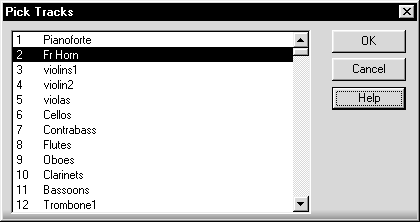 Нотатор выводит в своем окне до 24 нотных станов стандартной нотации. Находясь в нотаторе, можно в любое время нажать на кнопку Pick Tracks и выбрать другие треки (не только те, с которыми окно нотатора было открыто описанным способом). При этом откроется окно Pick Tracks, показанное на рис. 5.3.