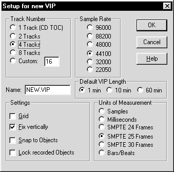 проект), или VIP. Это по сути многоканальный магнитофон с расширенными функциями редактирования каждого канала в отдельности и всей записи в целом. Все операции вырезки, изменения уровня громкости, наложения и замещения звука, введения эффектов и пр. полностью виртуальны. Это означает, что исходный звуковой материал при любых экспериментах не разрушается. Рассмотрим подробнее эту технологию.Для начала вы создаете новый виртуальный проект: выполняете команду New Multitrack Project (Новый многоканальный проект) из меню File (Файл), которая откроет доступ к окну Setup for new VIP (Установки нового виртуального проекта), показанному на рис. 1.1.