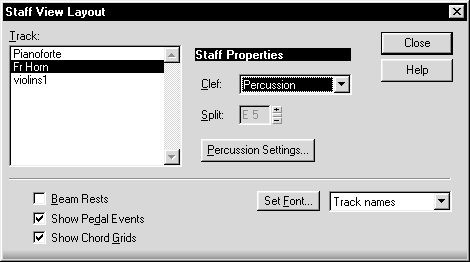 Окно Staff View Layout вызывается при нажатии на кнопку Layout (Размещение) инструментальной панели окна Staff View. В списке Track выведены названия треков, из которых образована нотная запись.
