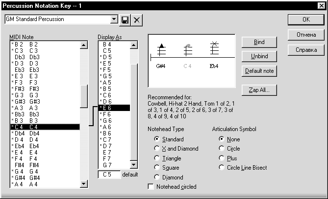 В этом окне определяется вид нотации для ударных в зависимости от ваших задач.