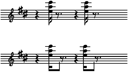 Ребра связывают паузы так, словно они являются нотами. Вариант нотации без связывания пауз (вверху) и со связыванием (внизу) показан на рис. 5.10.