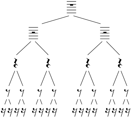 При написании нот указанная соизмеримость отражается в их различном графическом начертании, как показано на рис. 5.12: длительность каждой ноты соответствует половине длительности ноты, изображенной строкой выше. Графическое начертание целой ноты показано на этом рисунке в самой верхней строчке. Далее (сверху вниз) показано начертание нот соответственно: половинной, четвертной, восьмой и шестнадцатой.