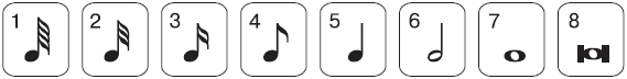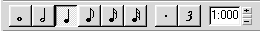 Шесть кнопок, изображенных на рис. 5.16, позволяют выбрать длительность для вставляемой ноты от целой до тридцать второй. Кнопки правее указанных дают возможность увеличить длительность (нота с точкой) или ввести ноты с длительностями особого деления (триоли, секстоли и т. д.). Справа в дисплее показана выбранная длительность в долях и тиках или только в тиках (если длительность меньше четвертной, так как четвертная нота считается одной долей).