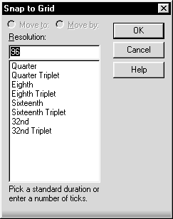 Для каждой отдельной ноты можно выбрать различные параметры Snap to Grid. Нажмите соответствующую кнопку на инструментальной панели, удерживая при этом нажатой клавишу Shift, и откроется окно Snap to Grid, показанное на рис. 5.17. Например, если требуется вставить половинную ноту в позицию последней в такте четвертной ноты (чтобы получить две слигованные четвертные ноты), следует установить