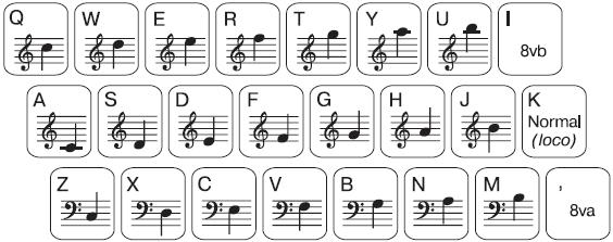 Теперь щелкните мышью по любому такту. Такт очерчивается прямоугольником, и в нотации появляется указатель в виде небольшого горизонтального прямоугольника. С его помощью определяется высота ноты. Перемещать этот указатель вверх или вниз можно либо клавишами управления курсором, либо щелчком мыши, либо нажимая клавиши на клавиатуре компьютера согласно диаграмме, изображенной на рис. 5.22.