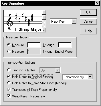 Если требуется перемещать по высоте (транспонировать) много нот, воспользуйтесь командой Transpose из меню Edit.