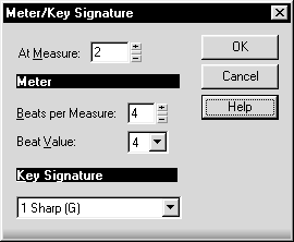 В поле At Measure (С такта) задается номер такта, начиная с которого будут действовать новый размер и новые ключевые знаки альтерации.