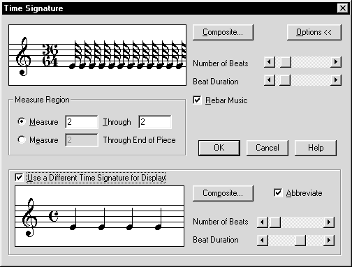Кнопка Options (Опции) в окне Time Signature предназначена для открытия дополнительной части окна (ниже кнопок OK, Cancel и Help): первоначально эта часть закрыта.