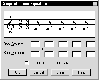 Поля Beat Groups (Группы долей) предназначены для ввода верхнего числа показателя размера, причем можно пользоваться знаками плюс ( + ) и десятичная точка (.). В поля Beat Duration (Продолжительность доли) вводится нижнее число показателя размера.