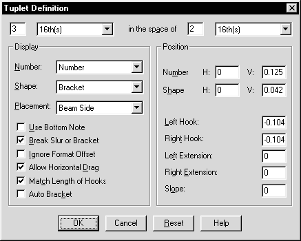 При вводе триолей (секстолей и пр.), на экран будет выведено диалоговое окно Tuplet Definition (Настройка нот особого деления длительностей), показанное на рис. 5.31. Оно появляется, если щелкнуть по первой ноте из группы.