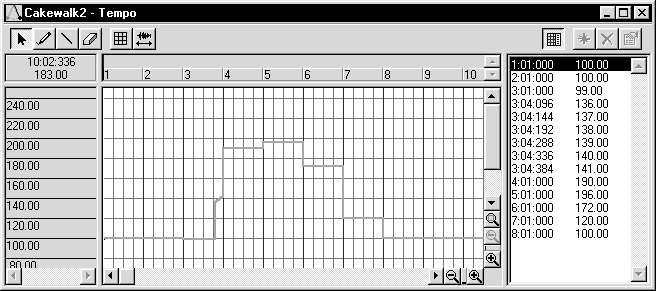 В окне Tempo (Темп) изменения темпа показаны в виде графика и в виде списка. График можно править с помощью мыши, как в любом графическом редакторе, а в списке – редактировать, вставлять и удалять численные значения темпа.