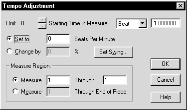 В секции Measure Region (Область тактов) следует указать номера тактов, на которые распространяется смена темпа: Measure (От такта.) Through (До.) или Measure Through End of Piece (От такта. до конца).