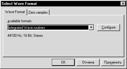 Параметры создаваемых WAV-файлов задаются глобально для всех дисков с помощью команды Settings → Wave format (Установки → Волновой формат) из меню DAC. При этом открывается диалоговое окно Select Wave Format (Выбор волнового формата), вкладка Wave Format (Волновой формат) которого показана на рис. 6.2.