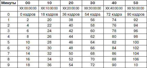 Таблица 6.1. Соответствие пропущенных кадров минутам, истекающим