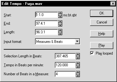 В диалоговом окне Edit Tempo (также доступно из меню Special), показанном на рис. 6.9, вы можете определить число ударов в минуту Beats per minute и число ударов в такте Beats in a measure. Эти значения используются для вычисления длительности тактов и длительности нот.