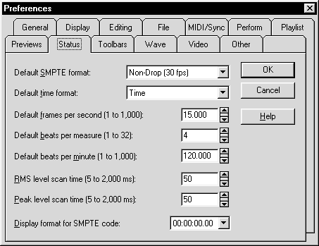 Значения по умолчанию для Frames и Beats устанавливаются на вкладке Status в окне Preferences (меню Options), показанной на рис. 6.10.