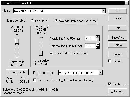 При подготовке к нормализации следует просканировать весь файл, даже если будет нормализована лишь его часть. Нажав кнопку Scan Levels, вы сохраните текущие значения пиков и RMS. Это позволит попробовать разные уровни Normalize to без повторного сканирования всего файла.