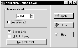 Секция окна Maximum level (Максимальный уровень) используется для установки уровня. Полная нормализация (увеличение громкости до максимального уровня) достигается при установке максимального уровня в 0 дБ, 100 % или 32767 условных единиц, в зависимости от шкалы измерения, которая используется в данный момент.