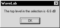 Кнопка Get peak level (Определить пиковый уровень) служит для определения уровня самого громкого сигнала в выделенном фрагменте звукового файла. Найденный уровень отображается в окне, показанном на рис. 1.35. Эта возможность используется, например, в том случае, когда надо решить, имеется ли потребность в волновой нормализации или нет.