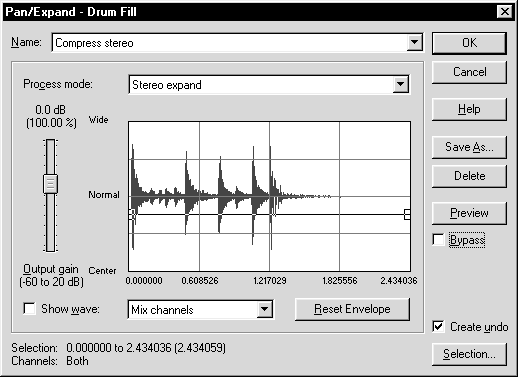 Панорамирование и расширение стереобазы в Sound ForgeВ диалоговом окне Pan/Expand (Панорамирование/Расширение базы), показанном на рис. 1.39 и доступном по команде Pan/Expand из меню Process, вы можете изображать панораму в виде графика или MS-кривой. Этот график будет применен к текущему выделению данных. Для изменения формы кривой можно использовать до 16 точек.