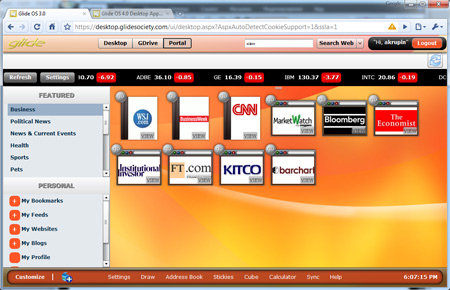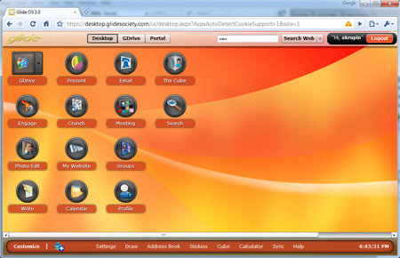 Рабочее окружение Glide OS поделено на три области - Desktop, GDrive и Portal, для переключения между которыми предусмотрены соответствующие клавиши в верхней части окна браузера. На первом экране представлены ярлыки приложений - почтового клиента, текстового и графического редакторов, инструмента для создания презентаций, органайзера, медиаплеера, калькулятора и некоторых других программ, список которых, к сожалению, не блещет разнообразием. Некоторых пользователей наверняка огорчит отсутствие IM-клиента, архиватора, PDF-просмотрщика и прочего привычного ПО. В будущем, быть может, подобные продукты появятся в онлайновой системе, пока же о них остаётся только мечтать. Что, впрочем, совсем не вредно.