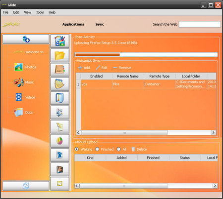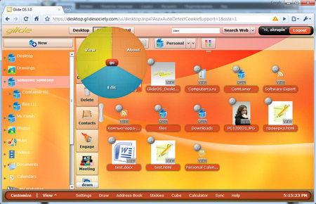 Вторая область рабочего стола - GDrive - оккупирована элементами управления хранящимися в недрах Glide OS файлами. Имея на руках халявные 30 Гб и толстый интернет-канал, можно забить систему всяким разным хламом, и чтобы в загружаемых на сервер данных было проще разбираться, создатели ОС заранее предусмотрели несколько тематических директорий - Music, Videos, Photos, Documents и др. Пользователь может создавать свои папки (контейнеры в терминологии создателей ОС) и копировать в них файлы как самостоятельно через браузер, так и посредством специальной утилиты Glide One Sync, доступной для различных платформ и позволяющей выполнять автоматическую синхронизацию данных с онлайновой службой.