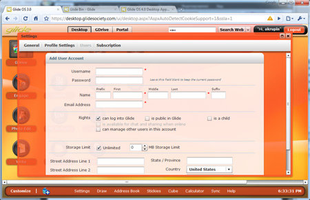 В отличие от ряда других аналогичных проектов, Glide OS является многопользовательской онлайновой системой, допускающей совместную работу с документами, файлами и программными продуктами. С помощью включенных в состав ОС инструментов, можно проводить совещания и интерактивные конференции, планировать задачи и обмениваться сообщениями. Для организации коллективной работы в Glide OS предусмотрен механизм создания пользовательских аккаунтов, права которых можно регулировать в соответствии с выполняемыми в системе задачами. Любопытно наличие в настройках учётных записей галочки Is a child. Зачем она нужна, полагаем, несложно догадаться.