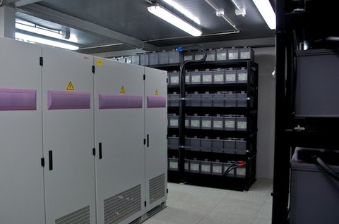 В другом конце коридора - основная батарейная комната. Здесь куда более шумно - оборудование работает, а не пребывает в режиме ожидания. Шкафы и батареи - те же самые.