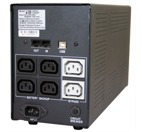 Максимальная нагрузка - 1500 ВА (900 Вт). Устройство оснащено стабилизатором напряжения, уровень входного напряжения - от 172 до 272 В, уровень выходного напряжения - от 198 до 242 В. Форма выходного напряжения при работе в автономном режиме - ступенчато-аппроксимированная синусоида (постоянный ток, преобразованный в переменный через инвертор простой конструкции).