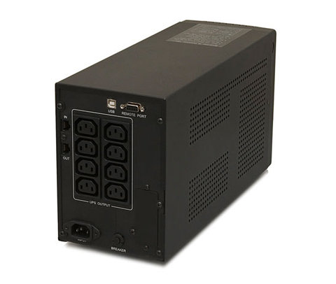 Устройство может подключаться к ПК через интерфейс USB для настройки и контроля параметров работы. На задней панели также установлен COM-порт (RS-232), который может использован для удалённого управления ИБП или включения его в состав автоматических систем. Внутри корпуса предусмотрен отсек для установки SNMP-адаптера, позволяющего ИБП работать в составе локальных сетей. В наличии - функция "холодный старт".