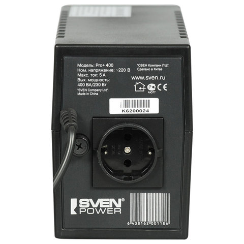 Максимальная нагрузка - 400 ВА (230 Вт). Устройство оснащено стабилизатором напряжения, уровень входного напряжения - от 165 до 275 В, уровень выходного напряжения - от 198 до 242 В. Форма выходного напряжения при работе в автономном режиме - ступенчато-аппроксимированная синусоида (постоянный ток, преобразованный в переменный через инвертор простой конструкции).