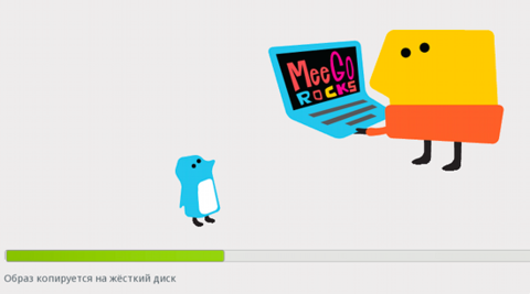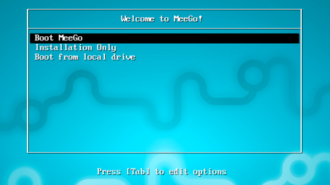 При загрузке с установочного носителя пользователь увидит меню GRUB, в котором можно выбрать запуск MeeGo без установки на жесткий диск, инсталляцию системы или загрузку с винчестера.