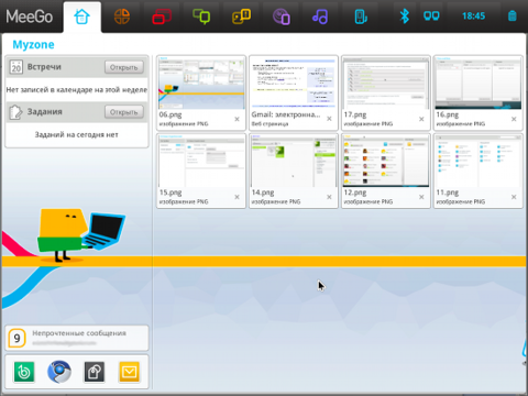 В верхней части рабочего стола расположена область переключения панелей, которая занимает довольно много места. Скрыть ее нельзя, но кнопки панелей можно добавлять и удалять. По умолчанию активна "MyZone", которая содержит ярлыки основных приложений, ссылки на недавно открытые документы и сайты, сообщения веб-сервисов и т. д.