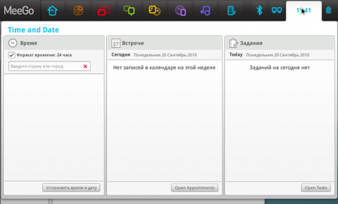 Предназначение остальных панелей очевидно: настройка Bluetooth, сетевых соединений и системной даты. Последняя панель позволяет также настроить "Встречи" и "Задания".