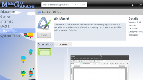 Для неопытных пользователей существует каталог программ MeeGo Garage. Вероятно, идея этого сервиса позаимствована у разработчиков Ubuntu Software Center - со временем здесь должны появиться коммерческие приложения, но пока его клиентская часть работает только с программами из репозиториев MeeGo.