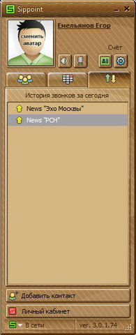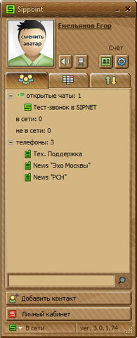 Тут же, нажав кнопку "Личный кабинет", можно войти в свой аккаунт и произвести нужные настройки, оплатить услуги связи или просмотреть статистику. Ещё ниже можно выбрать статус соединения: "В сети", "Отошёл", "Нет на месте" или "Не беспокоить". Жаль, что нет пункта "Невидимый", имеющегося у некоторых конкурентов.