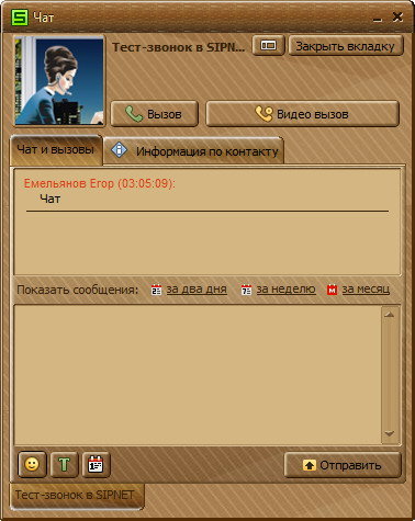 Щёлкнув дважды на любом контакте, вы получите доступ к функциям связи. Открывшееся окно предоставляет возможность начать письменный диалог с нужным абонентом, а можно совершить голосовой звонок или видеовызов. Присутствует возможность общения в чате с любыми Jabber/XMPP-клиентами, включая QIP.