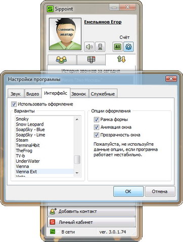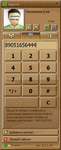 Маленькую картинку-аватар, как и в любой другой программе, можно выбрать на своё усмотрение - здесь нет ничего нового. Справа от аватара отображается текущий баланс счёта, который тут же можно и пополнить через интернет, просто щёлкнув по цифре левой кнопкой мыши. Щёлкнув по имени, вы получите возможность ввести некоторые контактные данные о себе.
