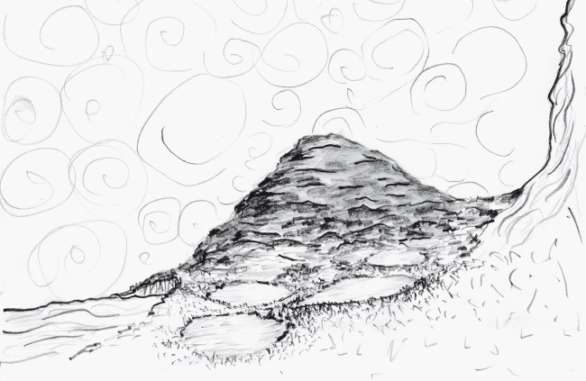 Гора с возведенными на ней дамбами, напоминающими затопленные рисовые террасы, поднимает средний класс из потока капитала, который иначе стремился бы к пределам длинного хвоста бедности (океан слева) и элитарному пику богатства (водопад или гейзер в верхнем правом углу). Социальное равенство зависит от того, может ли гора превзойти гейзер. Рисунок автора