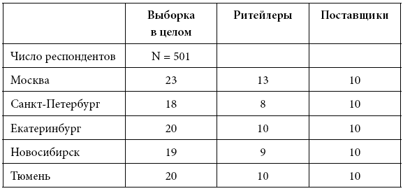 В результате в каждом городе опрошено по 10 респондентов, в том числе пять представителей торговых сетей и пять представителей поставщиков. Половина респондентов — женщины, половина — мужчины. Среди ритейлеров — три представителя крупных федеральных сетей и два представителя иностранных сетей, остальные работают в региональных и локальных сетях. Опрашивались директора компаний и заведующие магазинами, менеджеры по закупкам. Среди поставщиков — семь представителей компаний-дистрибьюторов и восемь представителей компаний-производителей. В их числе руководители коммерческих служб, менеджеры по работе с торговыми сетями. В выборку были включены компании разного размера, четыре из них — иностранные, остальные — российские.