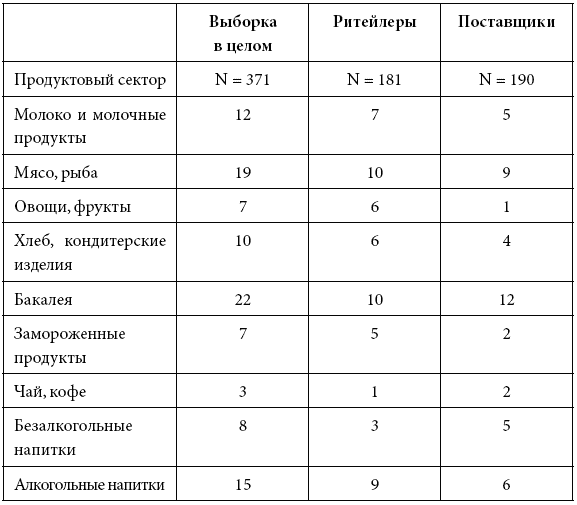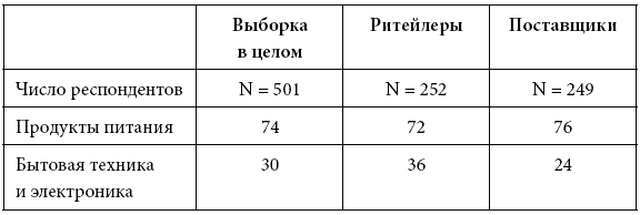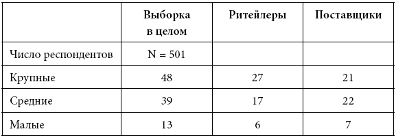 В результате в нашей выборке представлены компании разных размеров. В целом они делятся примерно пополам между категорией крупных и категорией средних и малых компаний (см. табл. 2.3). 48 % опрошенных составляют представители крупных игроков (включая 27 % менеджеров розничных сетей и 21 % поставщиков), 39 % представляют компании среднего размера (17 % ритейлеров и 22 % поставщиков), а 13 % представляют малые компании (6 % ритейлеров и 7 % поставщиков). Среди поставщиков несколько больше представлен средний бизнес: средние компании составляют 45 %, крупные — 41 %, а малые — 14 %.