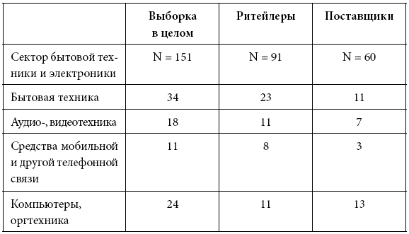 Отбор секторов. Объектом эмпирического исследования выступает розничная торговля — одна из наиболее динамично развивающихся с начала 2000-х гг. отраслей российского хозяйства. В работе анализируются два крупных сектора потребительских рынков: сектор продовольственных товаров и сектор бытовой техники и электроники (включая компьютерную технику и средства телефонной связи), который мы для краткости будем называть сектором электронных товаров. Вместе они охватывают около половины оборота российской розничной торговли.