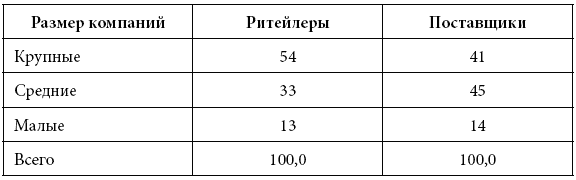 Размер компаний определялся нами на основе его оценок представителями компаний. В качестве дополнительных показателей нами используются следующие: число регионов, где работает данная компания; а также число торговых объектов, которые имеет компания (случай ритейлера), или число объектов, куда компания поставляет товары (случай поставщика).