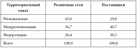 р = 0,01.Важная характеристика размера компании в сфере торговли связана с территориальным охватом её деятельности, измеряемым числом регионов, в которых она работает. С этой точки зрения хозяйственная деятельность розничных сетей (по крайней мере, пока) более компактна, а поставщики имеют более широкий территориальный охват и географически более мобильны. Это не удивительно, поскольку, в отличие от ритейлеров, им не нужно вкладывать столь значительные средства в торговую недвижимость для работы в том или ином регионе, они ограничиваются вложениями в логистическую инфраструктуру. В итоге число регионов, где работают поставщики, в среднем в 2,5 раза больше, чем число регионов, в которых располагаются магазины розничных сетей. Первые работают в среднем в 16–17 регионах, вторые — в 6–7 регионах.