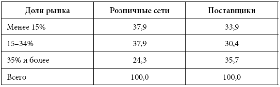 Более важным оказывается различие между двумя секторами. В продовольственном секторе, если верить полученным ответам, располагаемые доли рынка у ритейлеров заметно ниже, чем у поставщиков (22 % против 30 %) [32]. Не достигают планки в 15 % соответственно 46 % ритейлеров и 33 % поставщиков, а переходят порог в 35 % соответственно 23 % ритейлеров и 36 % поставщиков. Хотя заметим, что на данный вопрос менеджеры продуктовых сетей отвечали вяло, и на ангажированность позиций здесь нужно делать особую скидку, поскольку основное давление оказывается именно на продовольственные торговые сети. И даже среди крупных сетей в обладании долей рынка на уровне 35 % в этом секторе признаётся лишь каждый третий представитель, в то время как среди поставщиков себя спокойно относит к этой категории каждый второй.