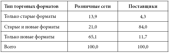 заметно более универсальны. Подавляющая их часть (84 %) поставляют товары в магазины как современных, так и традиционных торговых форматов; новыми форматами ограничиваются лишь 12 %; а исключительно со старыми форматами работают и вовсе единицы (4 %) (см. табл. 3.4). На работу только с новыми форматами даже в Москве и Санкт-Петербурге перешёл лишь каждый пятый поставщик (18–20 %), в остальных городах эта доля и вовсе минимальна.В итоге с супермаркетами (77 %) и магазинами у дома (71 %) поставщики работают столь же часто, как и с прилавочными магазинами (72 %). А распространённость работы с гипермаркетами (66 %), магазинами формата «кэш энд керри» (45 %) и дискаунтерами (45 %) здесь сопоставима с распространённостью поставок в павильоны и киоски (57 %), а также на розничные рынки (57 %). И даже с «удобными магазинами», расположенными на АЗС и транспортных магистралях, работает почти каждый третий поставщик (31 %).