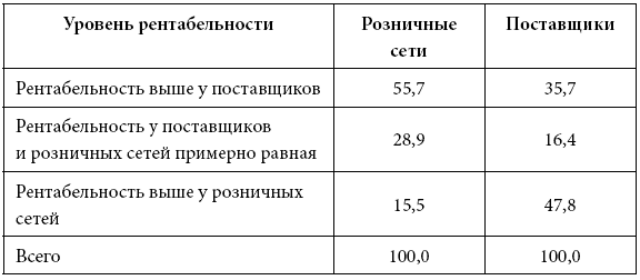 Нам кажется, что в данном случае более адекватными (хотя тоже с определёнными ограничениями) выступают оценки поставщиков, то есть той стороны, которая в публичной сфере представлена в качестве пострадавшей. И весьма интересно, что более чем каждый третий представитель поставщиков (36 %), указал на то, что именно поставщики имеют более высокий уровень прибыльности (а например, в Новосибирске таких поставщиков около половины). Причём среди крупных поставщиков таких 42 %, то есть их число в среднем приближается к половине. Это указывает на то, что ситуация, по крайней мере, вновь не столь однозначна, как это рисуется в аналитических репортажах о тотальном доминировании ритейлеров. Выросшая рыночная власть торговых сетей, видимо, вполне сочетается с более высоким маржинальным доходом производителей потребительских товаров.