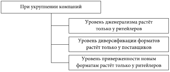 У поставщиков обнаруживается ещё менее определённая картина. Число конкурентов с укрупнением компаний не изменяется, и на оценках текущего уровня и динамики конкуренции это никак не отражается. Подобные связи отсутствуют и в секторе продовольственных товаров, и в секторе бытовой техники и электроники.